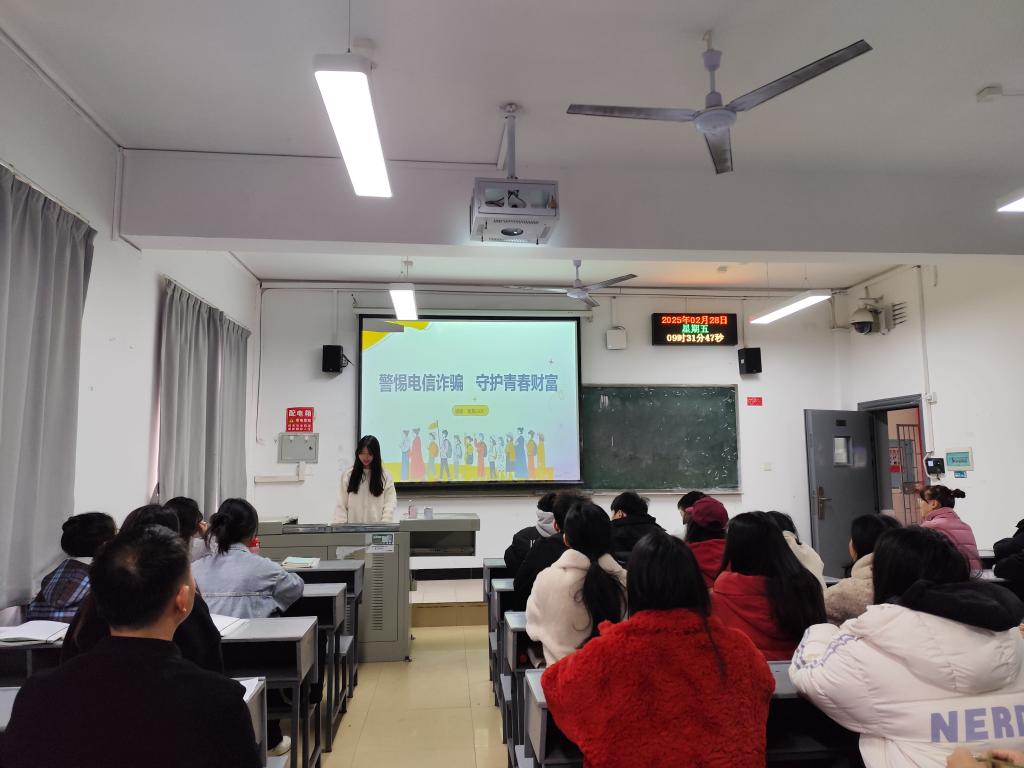 为切实提高学生反诈防骗意识和能力,筑牢校园安全防线,2月28日上午,国际物流学院商务英语2301班在教学楼101教室开展“警惕电信诈骗,守护青春财富”主题安全教育班会,学校党委委员、副校长罗勇及学院辅导员石丽共同参加班会。
