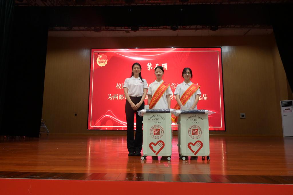 团委副书记唐鹰尼为西部计划志愿者佩戴绶带并赠送纪念品
