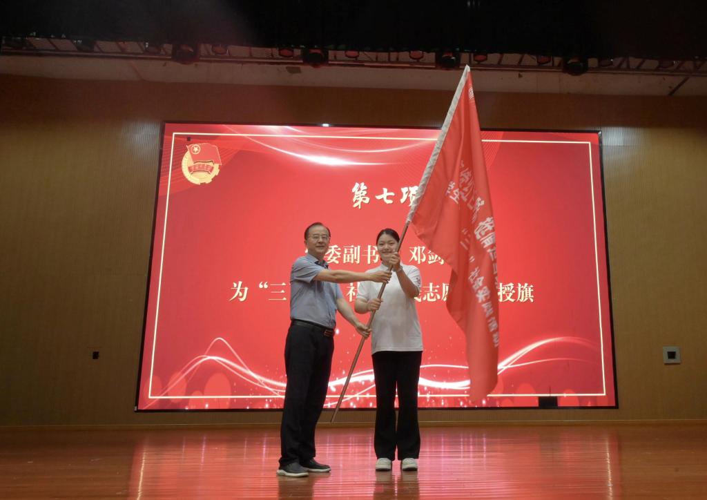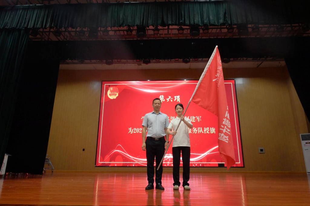 党委副书记邓剑波为暑期“三下乡”社会实践志愿者代表骆诗颖授旗
