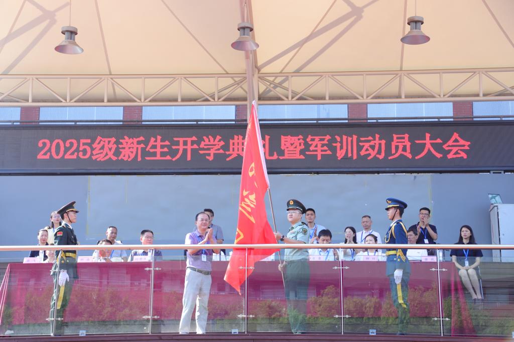 随后,军训团团长发表动员讲话。他表示,军事训练对于学生磨砺意志、增强体魄、培养纪律有着重要意义。在激昂的乐曲声中,校党委副书记邓剑波郑重向军训团授旗。团长接旗,标志着2025级学生军事训练正式启动。