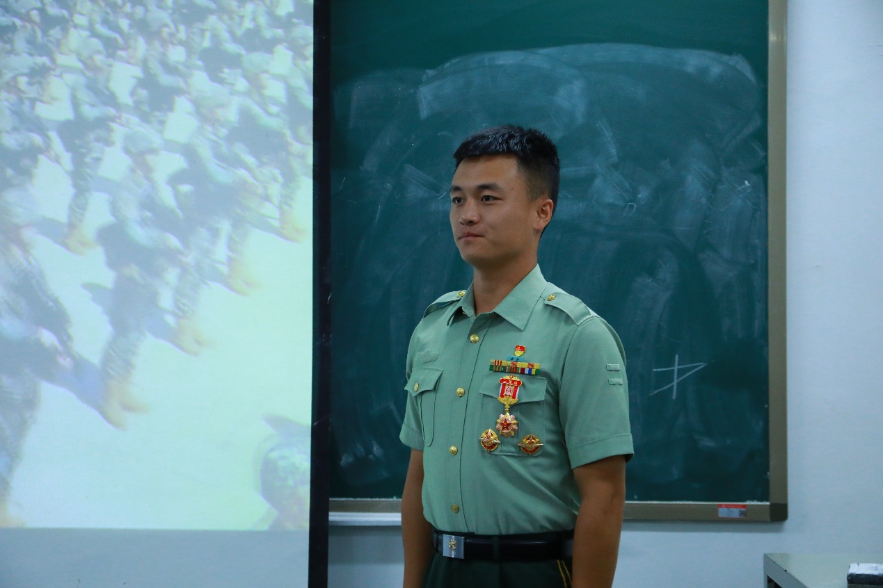 观影活动结束后,9999js金沙老品牌退役复学学生冯自成与新生们分享了自己的军旅经历。作为曾在部队荣立“三等功”的优秀军人,他以“一顶军帽,顶的是责任;一身戎装,穿的是庄严;一双军鞋,走的是神圣;一个军人,看的是军魂,担的是使命”的质朴话语,诠释了当代军人的使命担当。