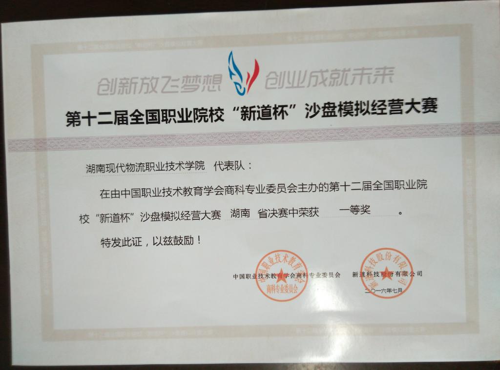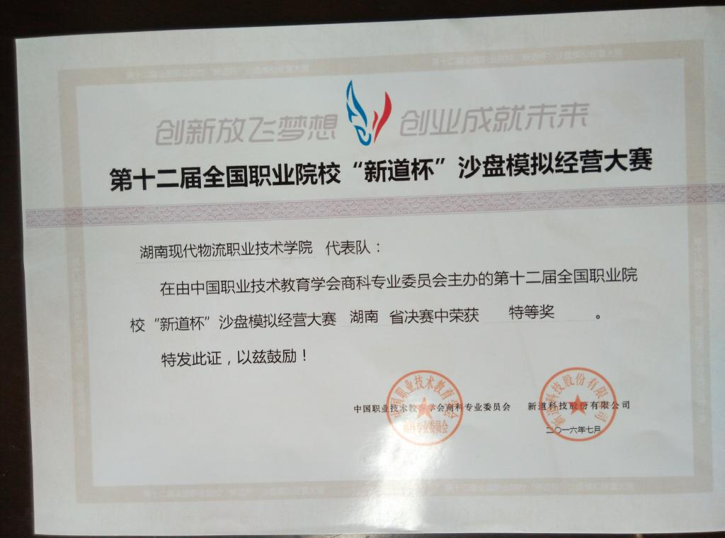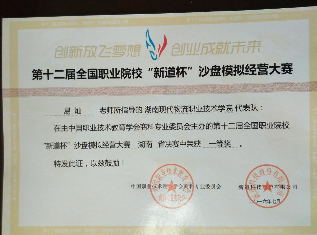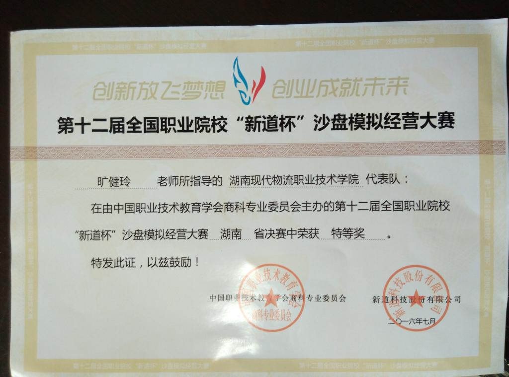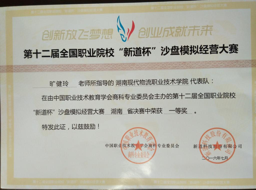 由旷健玲、陈建华老师所指导的9999js金沙老品牌代表队在由中国职业技术教育学会商科专业委员会主办的第十二届全国职业院校“新道杯”沙盘模拟精英大赛湖南省决赛中获得第一名,荣获特等奖!由旷健玲、易灿老师所指导的9999js金沙老品牌代表队在由中国职业技术教育学会商科专业委员会主办的第十二届全国职业院校“新道杯”沙盘模拟精英大赛湖南省决赛中荣获一等奖!