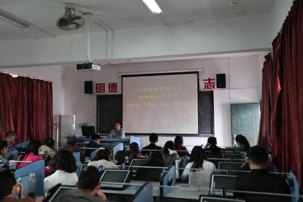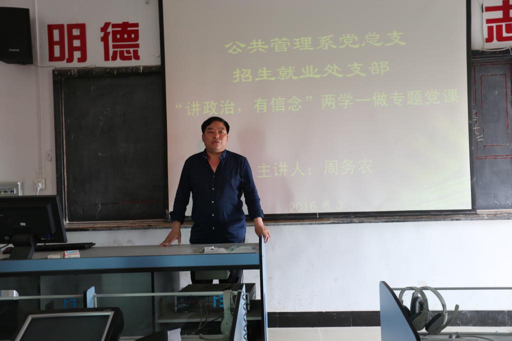 2016年6月3日中午,公共管理系党总支和招生就业处党支部在科技楼403投影教室开展“讲政治、有信念”两学一做专题党课活动。公共管理系党总支赵翾主持会议,学院副院长周务农主讲,参加此次党员学习的有公共管理系全体教职工党员、公管系学生党员以及招生就业处全体党员。