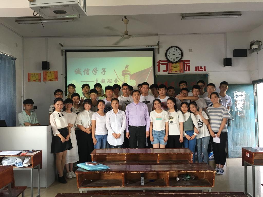 李院长做点评,他说此次班会形式多样、主题鲜明、艺术性较强,建议同学们多联系身边的实际,深挖身边关乎诚信的事,将其真实化、具体化;升华诚信的含义,从个人、社会、国家三个层面层层上升,进而从价值观深入到价值体系。李院长教导同学们,正视社会主义核心价值观,了解其真正的含义,融入行动,才能让属于自己的核心价值观慢慢发生改变。同学们聚精会神的听着两位老师的教诲,一张张年轻的面庞上尽是认真和坚定。班会圆满结束,李院长、高老师与全班同学拍照留影。