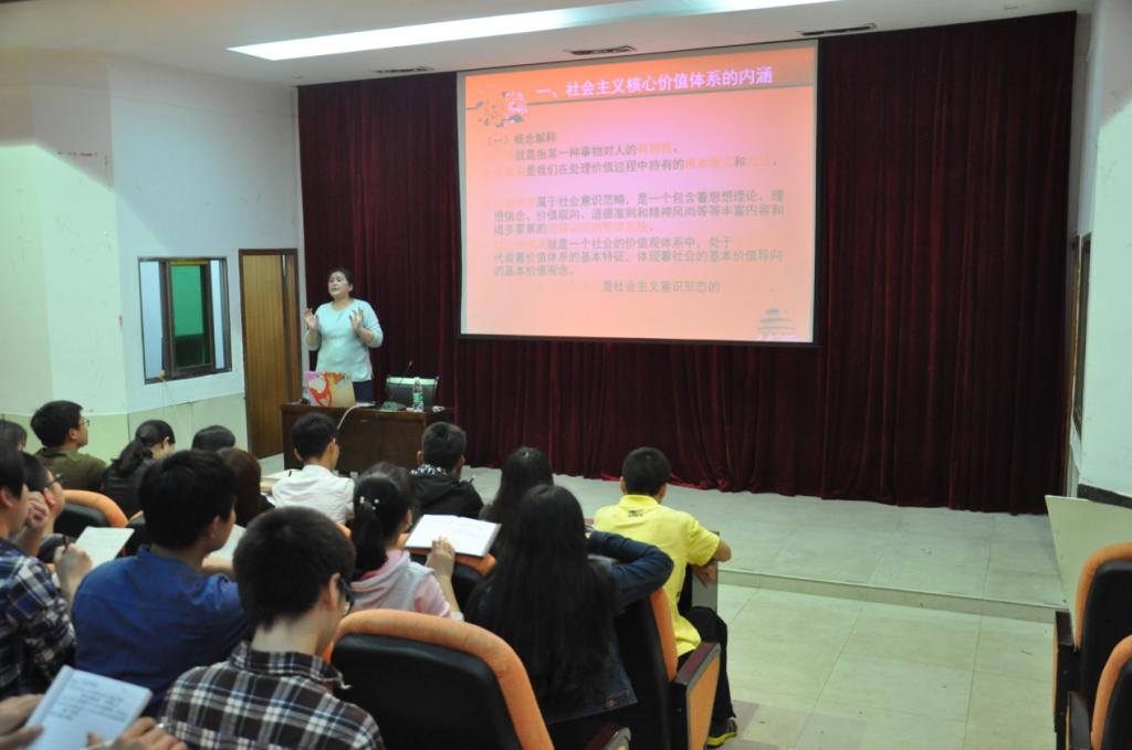 在此次党课中,钟静主任围绕社会主义核心价值体系的内涵、培育社会主义核心价值体系的重要意义以及培育践行社会主义价值体系三个方面展开了专题讲座。钟静主任着重强调,在中国特色社会主义的道路愈发宽广、发展前景愈发光明的今天,作为当代大学生,应该顺应时代需要,紧跟时代步伐,整合智慧,在党的十八大明确提出的社会主义核心价值观的感召下,从国家倡导富强、民主、文明、和谐;从社会倡导自由、平等、公正、法治;从公民倡导爱国、敬业、城信、友善的三个层面下,努力学习,奋勇拼搏,积极进取,见贤思齐,不断严格要求自己形成一整套体系的价值观,让自己成为一个具有完整人格、健全三观的大学生。