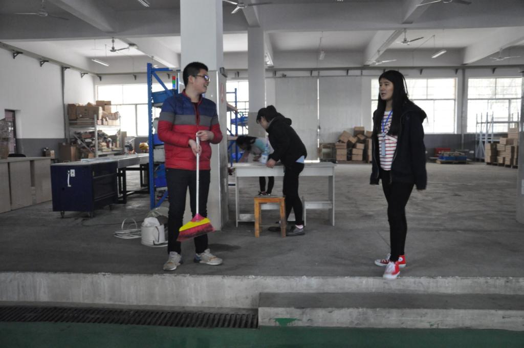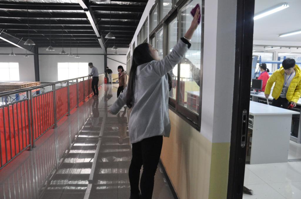 本次大扫除的地点主要是实训工厂的两层楼房,重点是玻璃和地面的擦洗。在劳动过程中,同学们分成两组分别对一楼二楼进行打扫,具体包括扫地,擦拭机器,拖地以及对脏货架的擦拭。所有同学不遗余力的进行清扫工作,仔细认真,耐心、用心的不放过任何一个死角。在大家齐心协力的合作下,实训工厂上下焕然一新,整洁明亮。