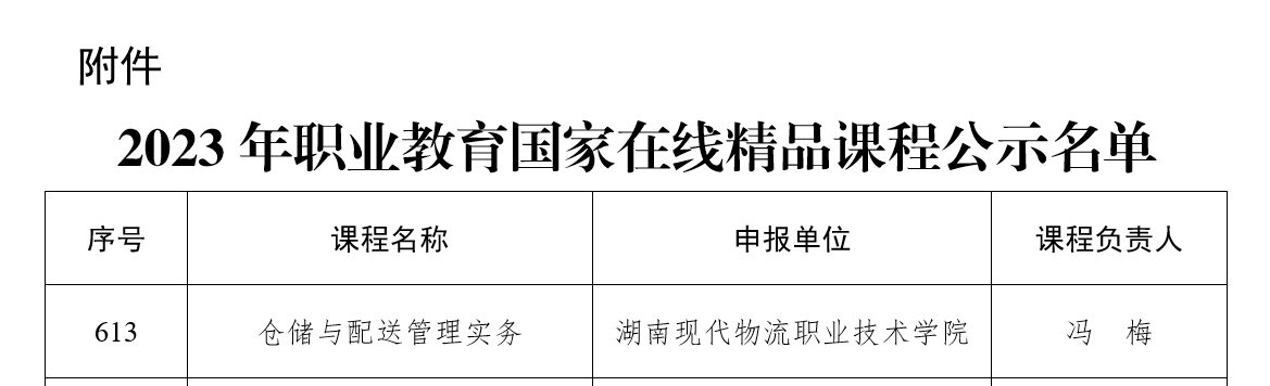 近日,教育部发布了2023年职业教育国家在线精品课程遴选结果公示,湖南现代物流职院冯梅教授申报的《仓储与配送管理实务》课程成功入选。
