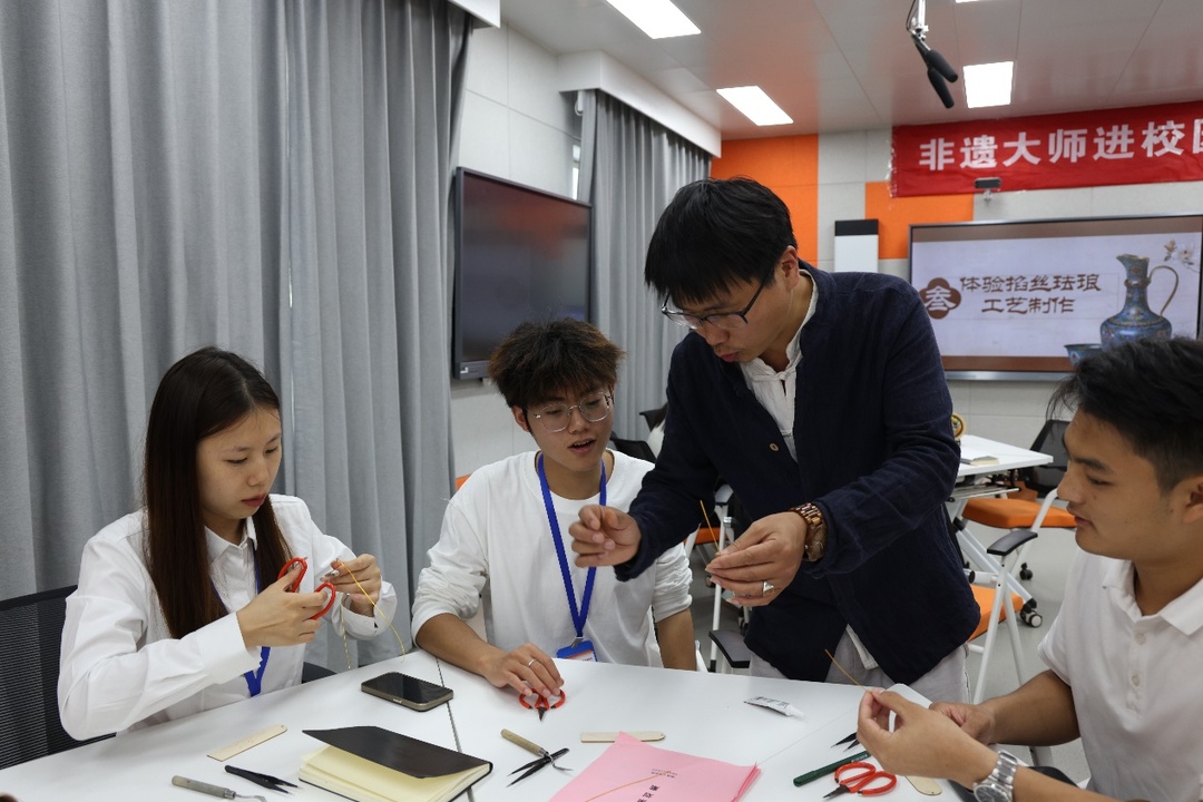 “没想到大学的第一节手工课竟是用掐丝珐琅工艺制作校徽,我太喜欢这样丰富多彩的大学生活了!”2024级学生刘观寅举着自己的作品兴奋地展示着。学生们专心制作的作品得到了非遗传承人的肯定和现场指导,隆厚兴表示:“同学们学习兴致非常浓厚,这也让我们坚定了把非遗文化带进高校,让大学生了解和传承非遗文化的信心。”