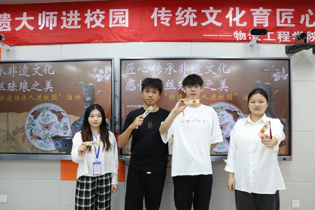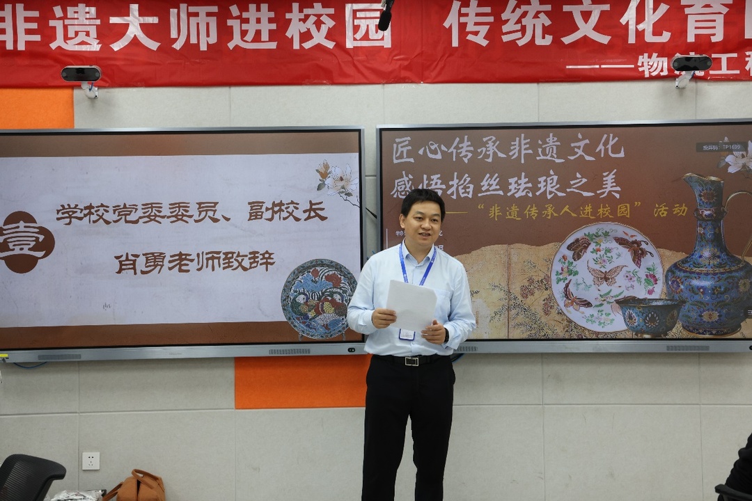 两位老师分别是掐丝珐琅釉彩制作技艺代表性传承人,厚兴景泰蓝艺术馆、大汉国际工匠院掐丝珐琅展示馆、华谊小镇非遗拾光坊创始人,湖南省工艺美术协会理事,长沙市工艺美术协会常务理事,长沙市非物质文化遗产保护协会会员隆厚兴和湖南省文化馆非遗展厅负责人姚颖林。两位老师在学校物流工程学院的邀请下走进校园,为各二级院学生干部代表带来了一场非物质文化遗产的盛宴,现场讲解掐丝珐琅文化历史,并手把手教学制作校徽及山水画书签,让师生们近距离感受非遗文化独特魅力。