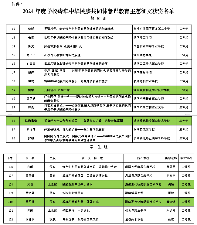 湖南现代物流职院积极组织师生参加2024年度湖南省学校铸牢中华民族共同体意识教育主题征文比赛,教师组熊馨老师的作品荣获二等奖、欧阳昌雄老师的作品荣获三等奖,学生组高颖老师指导吴笛同学和龚俊铭指导吴雯婷同学的作品均荣获二等奖。