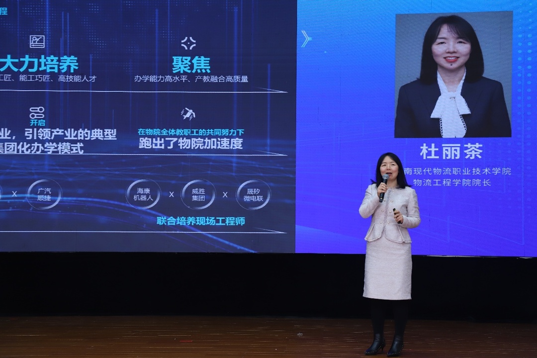 湖南现代物流职院物流工程学院院长杜丽茶代表高校做《聚焦物流行业数智化,校企“联姻”共育现场工程师人才》分享汇报,分享内容从智能物流装备技术产业集群的顶层设计逻辑到校企共育工程师人才的培养方案创新,从与各龙头企业深入合作的模式到双元育人的可喜成绩,系统介绍了学校如何敏捷响应智慧物流领域对AMR、AGV交付工程师的迫切需求,不断优化调整物流产业智能化升级,大胆推进物流工程技术专业工科化建设。通过整合龙头企业与该企业上下游企业资源,实现人才培养链和产业链的深度融合。