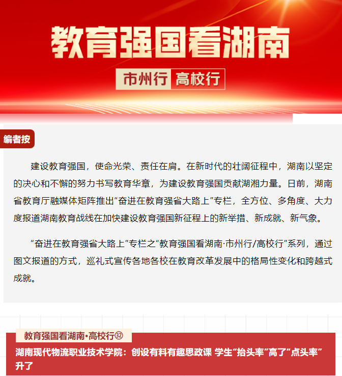 “我们的思政课不仅注重形式的创新,更注重内容的深度和系统性。思政课教师不仅要传授知识,更要引导学生树立正确的世界观、人生观和价值观,培养具有良好职业道德和职业能力的物流人才。”湖南现代物流职院党委副书记邓剑波说。学校将毛泽东同志诗词、红色家书等融入教学,通过情景剧教学法和话题讨论法,激发学生的学习兴趣,引导学生从被动接受转为主动探索,不断提升学生的爱国情怀、社会责任感、职业精神等。