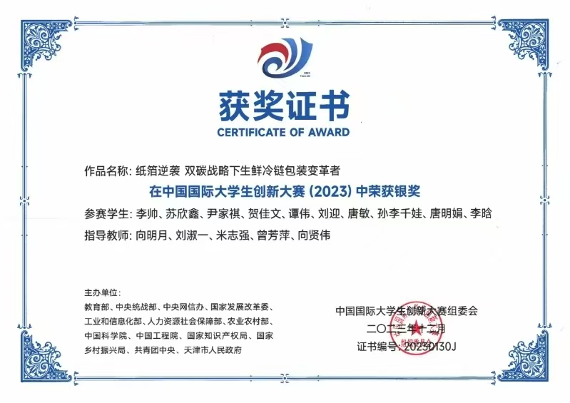 向明月指导学生荣获中国国际大学生创新大赛(2023)银奖