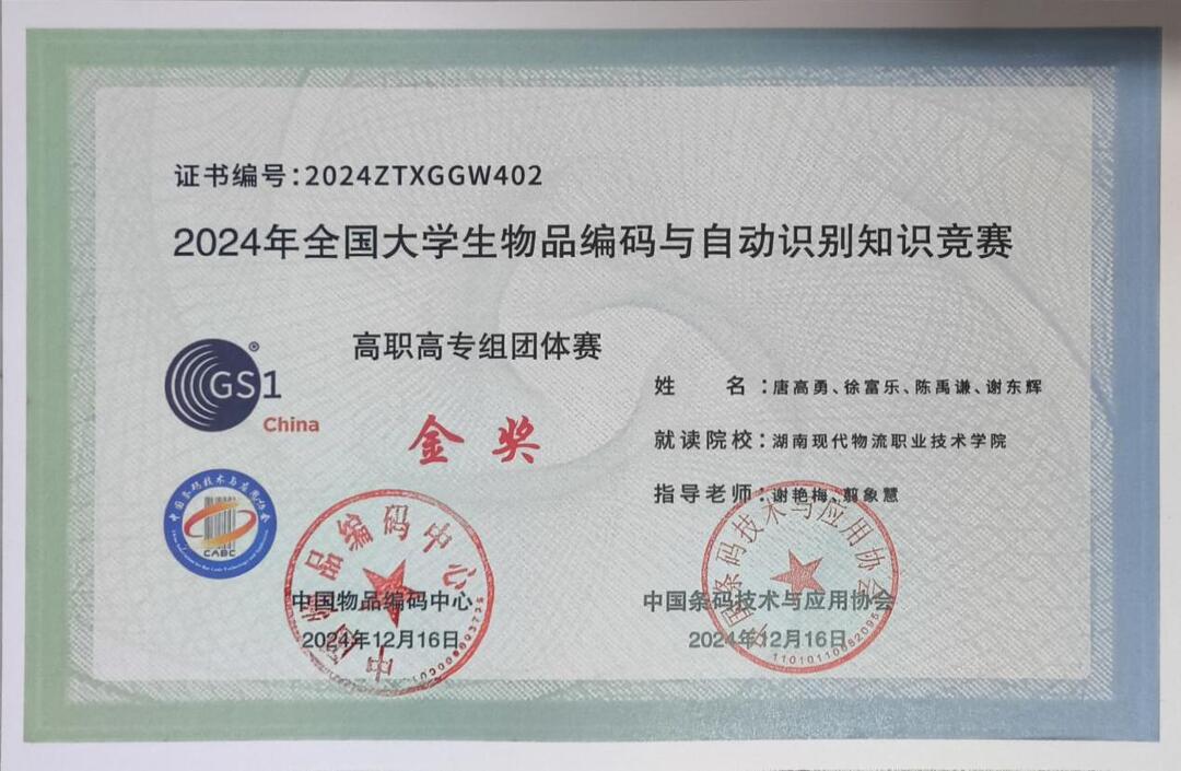 谢艳梅指导学生获2024年全国大学生物品编码与自动识别知识竞赛高职高专组团体赛金奖