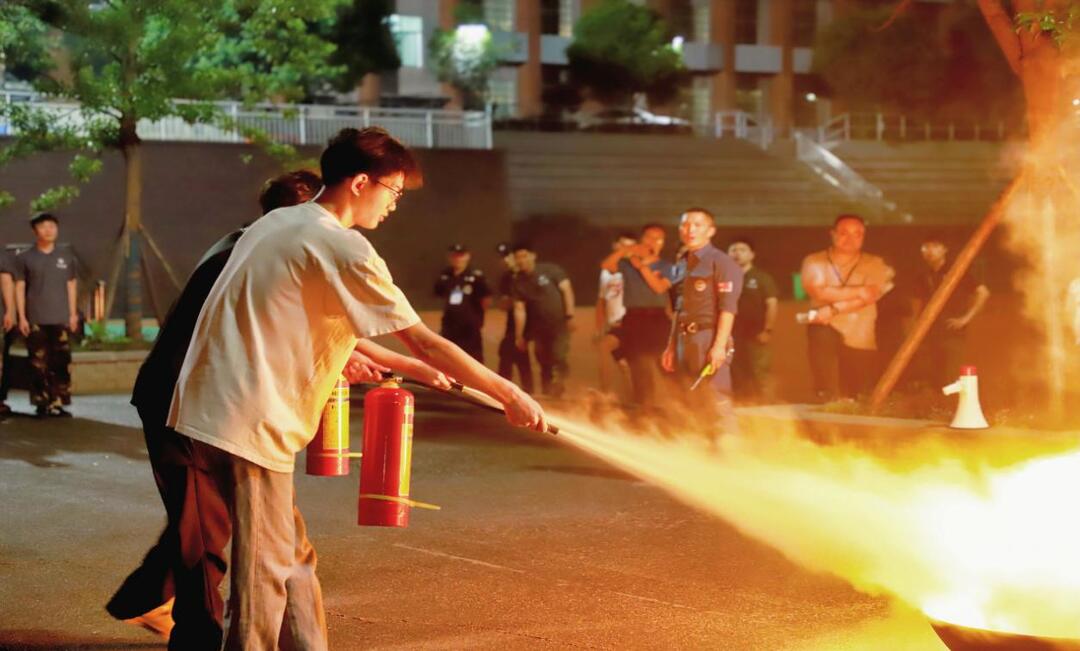 疏散结束后,救援队现场开设灭火技能培训区,师生灭火培训掀起高潮。教官专业讲解干粉灭火器“提、拔、握、压”四步操作法。该校安保人员和百余名学生代表分批实操PK,对准模拟火源扑灭油锅火、电器火。“以前只在视频里看过灭火器使用,亲手操作才发现角度和距离这么关键,必须站在上风口灭火!”刚完成演练的国际物流学院酒店管理2401班严子信抹着汗说。