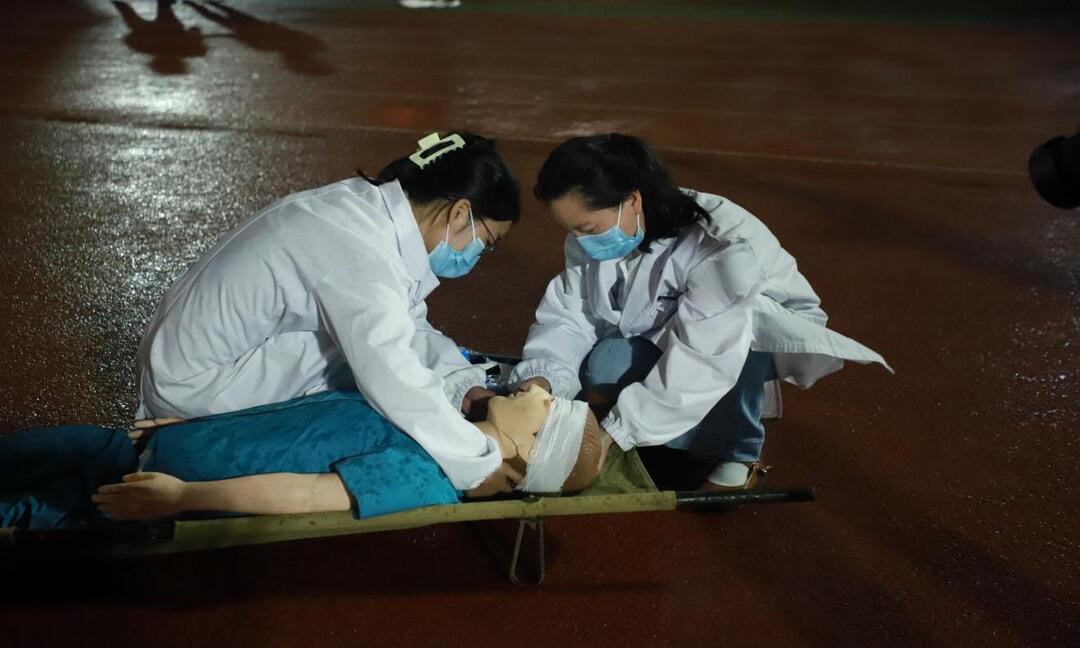 “报告!这里发现踝关节扭伤伤员!”“三楼东侧通道有人员昏迷!”演练特别设置3类突发伤情。救援队和校医务室医生指导师生实操:用衣物制作骨折临时固定装置,利用AED模拟机进行心肺复苏,用海姆立克法解救“气道异物梗阻”患者。该校医务室医生特别指出:“头部撞击伤员搬运时,务必保持脊柱稳定,这些细节可能改变生死结局。”