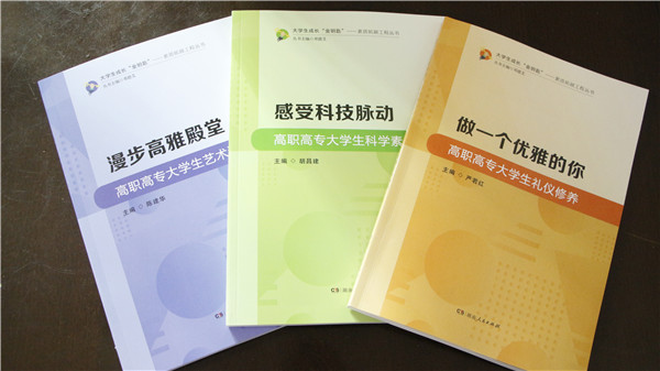 该校从大一到大三,实行 " 一学期一本书一主题 ",全方位提升学生综合素养。其中,《做一个优雅的你——高职高专大学生礼仪修养》、《漫步高雅殿堂——高职高专大学生艺术修养》和《感受科技脉动——高职高专大学生科学素养》三种书已印发,融入课堂,其余三种将在今年年底陆续发放至学生手中。