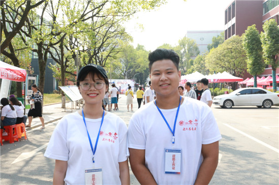 第三幅画卷是学长学姐的笑脸好灿烂。今年的物院学子对新入学的学弟学妹们更多了一份热情,笑意盈盈,互帮互助,一个个报名点旁都被新入学学生的行李堆积着,负责接待的学长学姐们青春靓丽,笑脸如花,热情地帮学弟学妹们搬行李和保管行李,十分贴心。