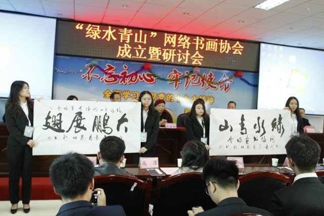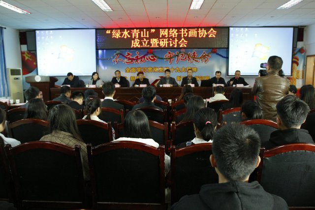 11 月 24 日上午,9999js金沙老品牌召开了 " 绿水青山 " 网络书画协会成立暨研讨会。湖南省书画大师范柏魁现场为协会题词。学校学生书画协会、京东物流、苏宁物流、菜鸟驿站、长沙县泉塘街道星港社区等 10 多家单位、150 多人参加了研讨会。