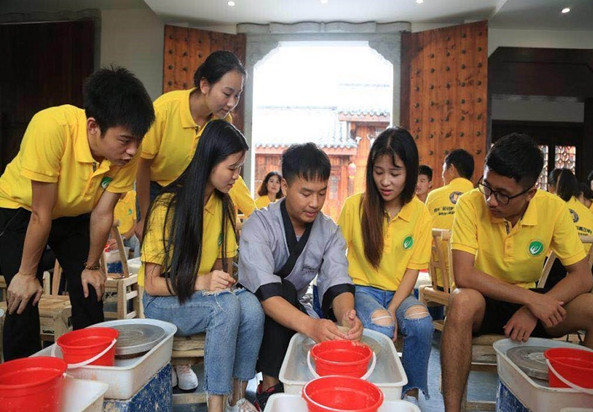 上午9点,团队抵达著名的醴陵瓷器博物馆,跟随讲解员的脚步,充分了解和学习了在改革发展潮流中醴陵陶瓷由兴起-衰败-兴盛的发展史。馆内云集了醴陵陶瓷各个时期、各种工艺的陶瓷精品,栩栩如生的图案、五彩缤纷的色彩、成熟技高的烧制技术让人赞叹不已,目前醴陵是继长沙窑后的又一名窑,已成为世界釉下五彩瓷原产地,很多国家领导人都将醴陵陶瓷作为中外友好的信物相赠。上午11点,团队抵达“湖南官立瓷业学堂”亲自尝试制作制瓷成型,师生共同动手体验制作陶瓷的乐趣。