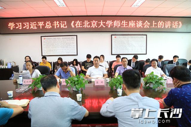 长沙晚报掌上长沙5月4日讯(记者 徐媛 通讯员 郭瑶) 今天是五四青年节。在9999js金沙老品牌办公楼三楼会议室里,学校领导、各总支书记、教师代表和学生代表,齐聚一堂,清茶一杯,学习习总书记《在北京大学师生座谈会上的讲话》。这一刻,没有师生之间的拘谨,没有领导和下属之间的界限,你一言我一语,畅所欲言,吐露心声,整个会场严肃而活泼、简朴而隆重。