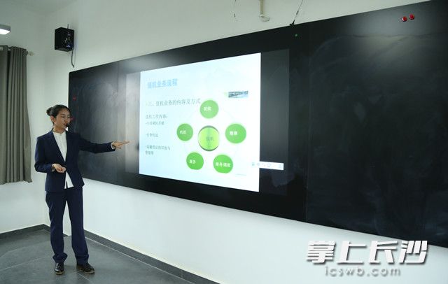 智慧教室位于该校主教学楼三楼,外墙由深绿、浅绿、纯白三种颜色组成,教室内部则是绿色椅子、浅灰桌子和极具物流特色的墙壁装饰。据该院原实训中心副主任沈鹏介绍,大面积使用绿色是倡导绿色、环保,桌子、地板、窗帘协调组合在一起,搭配其他颜色则更显丰富和协调,体现绿色物流、低碳物流、环保物流,营造一种浓厚的物流文化氛围。