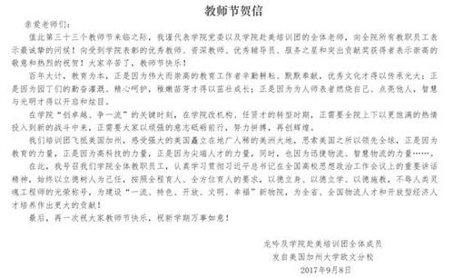 全体师生起立唱奏国歌后,胡昌建为大家带来了一份特殊的礼物,他饱含深情的宣读了学院党委书记龙吟及学院赴美培训团全体成员从美国加州大学发来的教师节贺信。