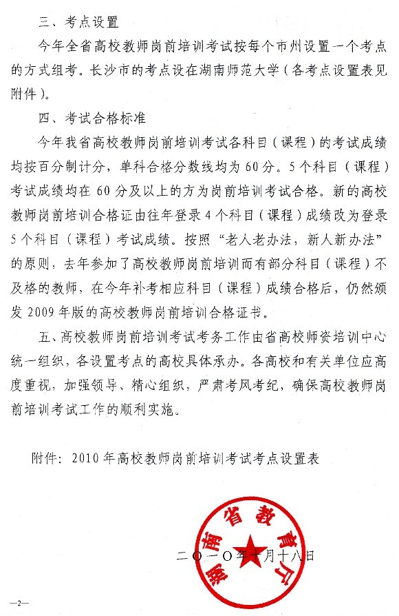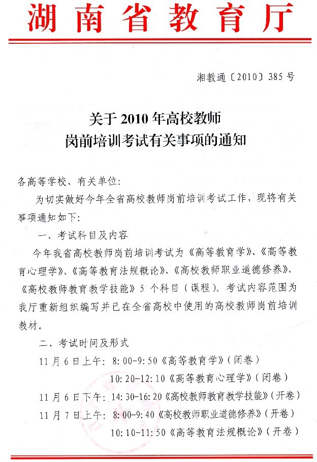 关于2010年湖南省高校教师岗前培训考试事项通知