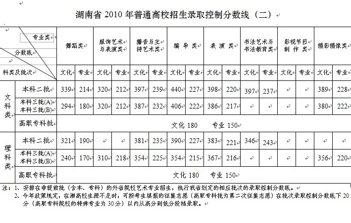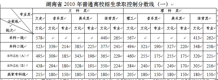湖南省2010年普通高校招生录取控制分数线(二)