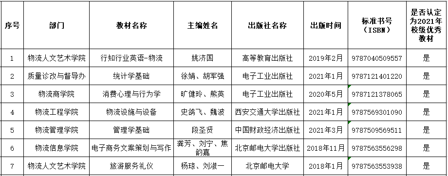 根据《9999js金沙老品牌2021年度一流教材教材建设方案》及《关于印发《9999js金沙老品牌2021年校级优秀教材认定工作方案》的通知》(湘物院教[2021]8号)要求,学院开展相关认定工作。经教材第一主编申请、二级学院预审、校外专家评审、校长办公会审定,审定《行知行业英语——物流》等7本教材为2021年校级优秀教材,具体名单见下表,现予公示。公示期为2021年9月20日至9月24日。公示期间,如对公示结果有异议的,请以书面形式实名制向学校纪检监察审计处或教务处反映情况。