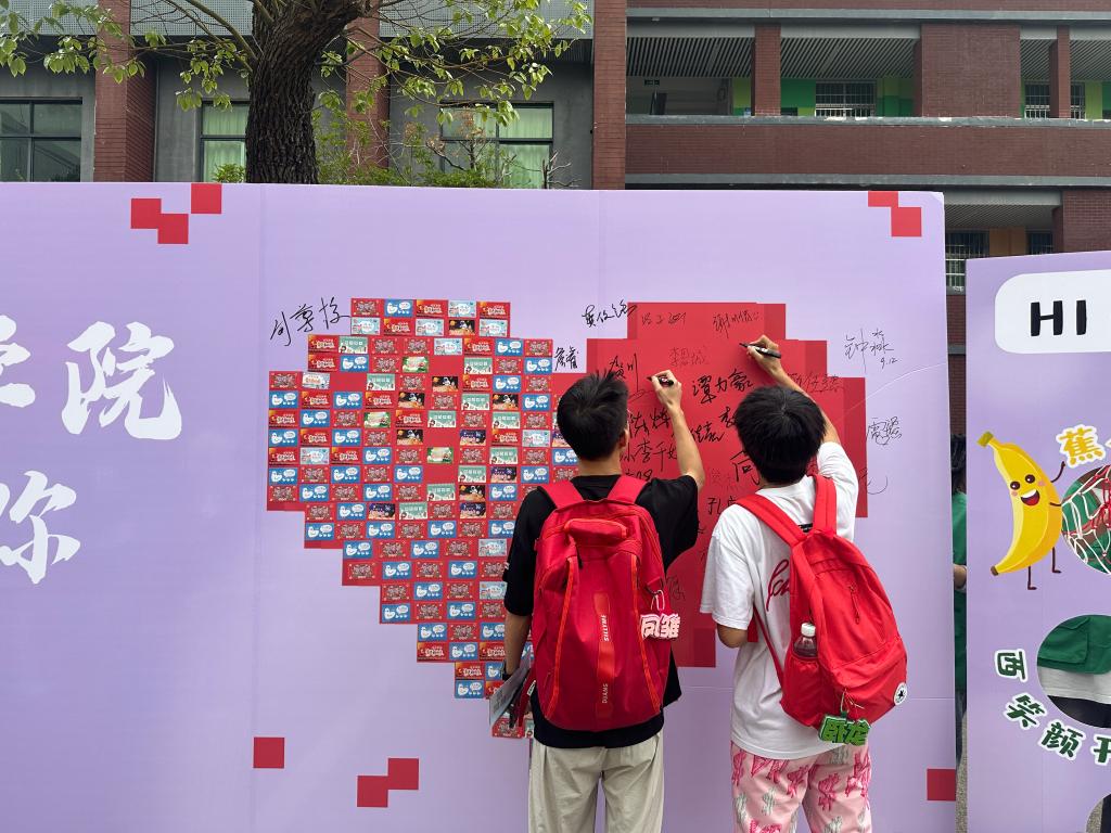 此外,物信学院新生接待点还设置了“一见倾‘新’恰同学少年”签名墙,一面精心设计的爱心签名墙成为迎新活动的焦点。新生们在此留下了自己的签名,记录下了初入校园的激动时刻,签名的每一笔都承载着对未来的憧憬和对校园生活的期待。