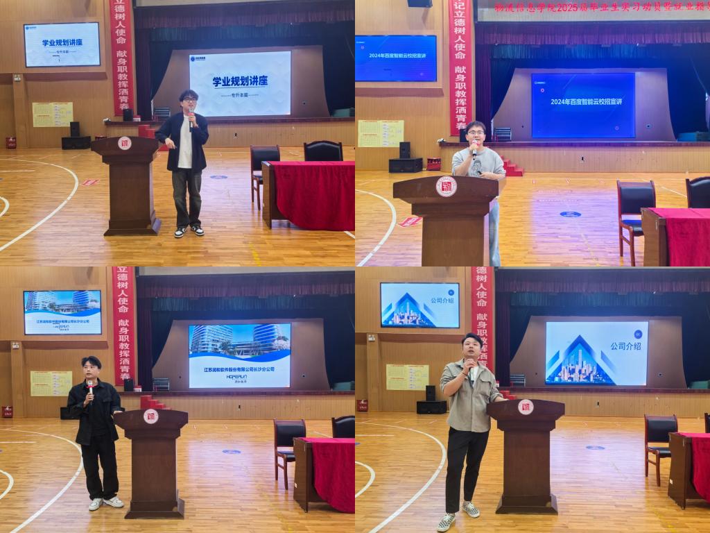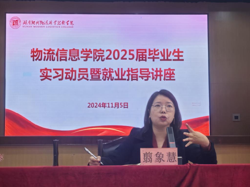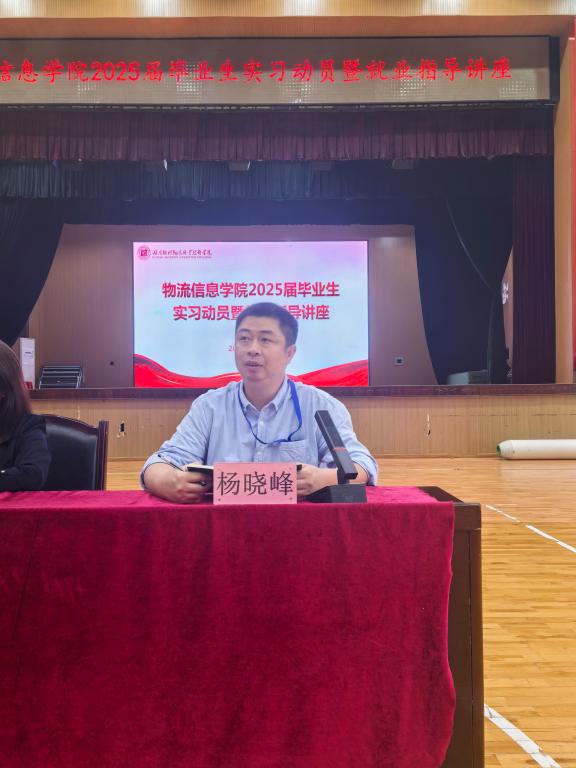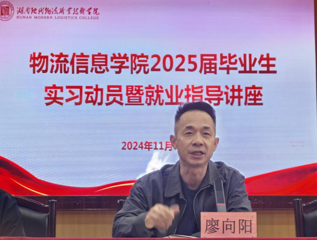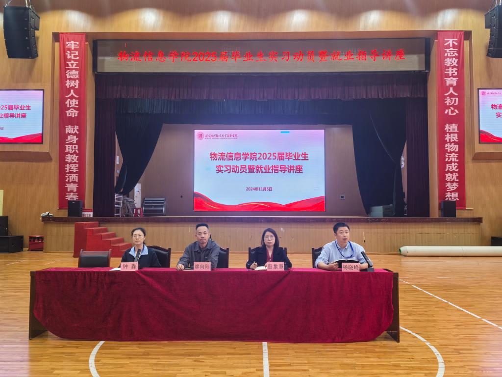 为全面贯彻落实党中央、国务院关于高校毕业生就业工作的决策部署,推动毕业生高质量就业,物流信息学院于11月5日下午14:00在体育馆召开2025届毕业生实习动员暨就业指导讲座。学院党总支书记廖向阳、院长翦象慧、党总支副书记钟淼、副院长杨晓峰、毕业班辅导员及各企业代表出席本次会议,会议由钟淼主持。