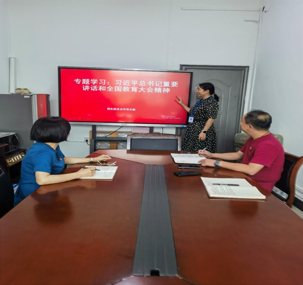 2024年9月27日在崇技楼三楼304会议室,招生就业合作党支部全体党员一起学习了习近平总书记的重要讲话,并传达了全国教育大会精神。招生办副主任黄雁同志以“弘扬教育家精神、勇担新时代使命”为题给全体党员上党课。