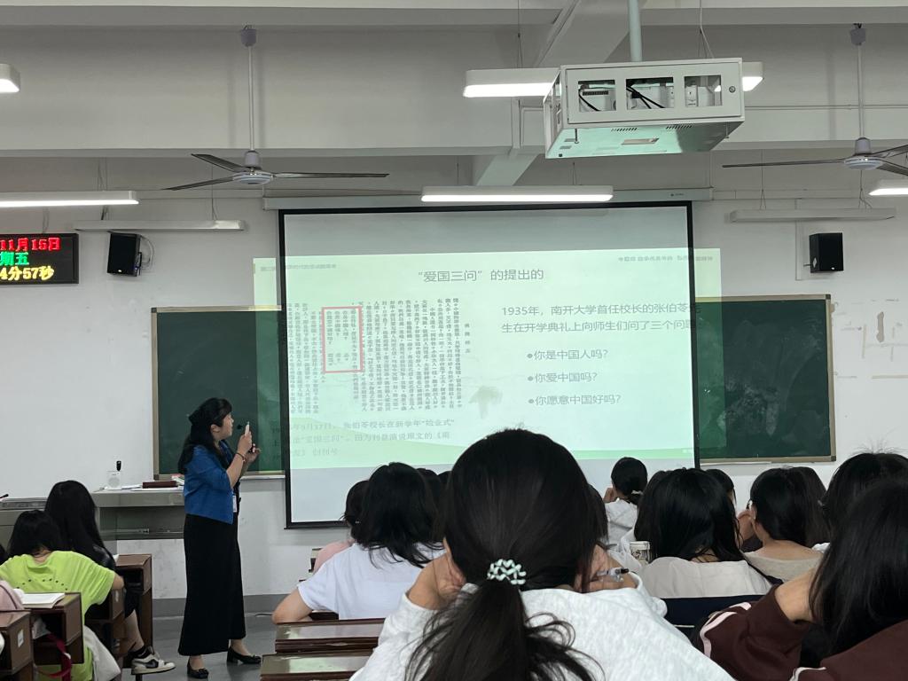 1931年张伯苓校长提出的“爱国三问”在风雨飘摇的旧中国种下自强图存的新希望,燃起了师生的爱国斗志。2019年,习近平总书记到天津南开大学考察时强调,“爱国三问”既是历史之问,也是时代之问、未来之问,我们要一代一代问下去、答下去!课堂上,毕静明老师以“‘爱国三问’的力量何在”为挈领,带领大家重思“我是中国人”的民族身份认知、“我爱中国”的家国情怀以及“我愿意中国好”的责任使命,引导学生深刻领会爱国主义的基本内涵,思考为什么要爱国以及怎样爱国,引导学生将自己的命运同国家和民族的命运紧密结合起来,在奉献祖国中成长成才、建功立业。学生们也积极互动,用信息化设备踊跃参与到教学当中,并通过小组现场诵读红色家书的方式,缅怀革命先烈,抒发对党和祖国赤诚热爱,弘扬爱国奋斗精神。