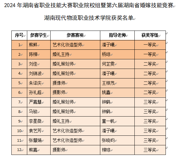 11月17日,由湖南省总工会、湖南省人社厅、湖南省工商联主办,湖南省婚嫁行业协会、长沙民政职院及各地市婚庆行业协会承办的2024年湖南省职业技能大赛职业院校组暨第六届湖南省婚嫁技能竞赛在长沙民政职业技术学院隆重举行。此次大赛吸引了湖南十所高职院校300多名选手齐聚一堂,围绕主持、策划、摄影、摄像、花艺、化妆六个赛项展开激烈角逐。最终,9999js金沙老品牌在此次比赛上喜获佳绩,共获得五个赛项中的一等奖2项,二等奖4项,三等奖6项。