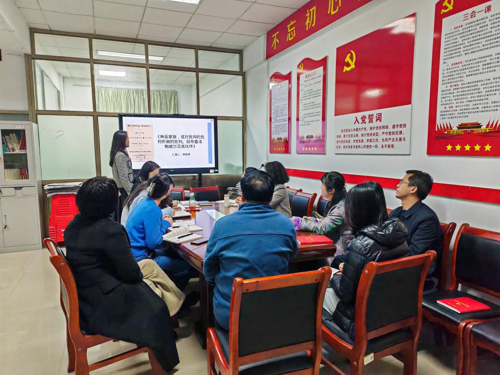 为落实“一月一课一片一实践”活动要求,切实提升支部党员理论水平,11月22日,宣传信息思政党支部在党员活动室召开支部大会。支部党员韩姝娉围绕马克思与恩格斯合著的《神圣家族》讲授了一堂精彩的微党课。