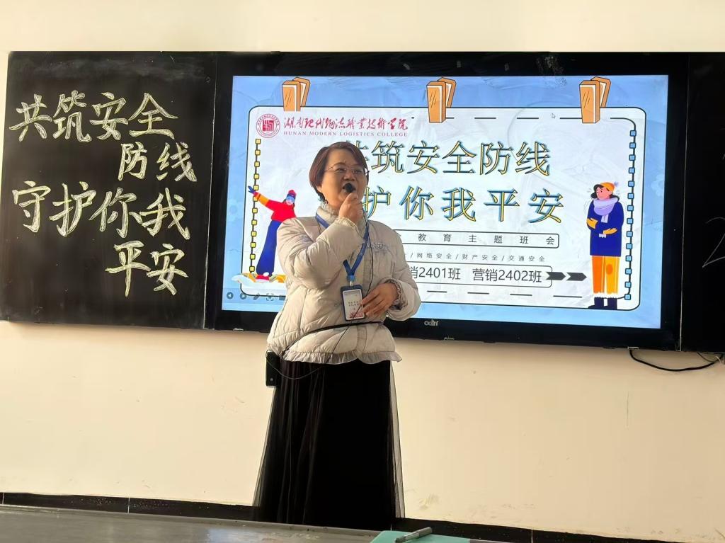 为进一步增强学生们的安全意识,提升自我保护能力,确保学生们校内校外的人身安全和财产安全,物流商学院营销2401和2402班于2024年12月23日召开以“筑牢安全防线,守护你我平安”安全教育主题班会,物流商学院院长旷健玲,辅导员陈珊和两个班级全体同学共同参会,班会由营销2401班王可欣主持。