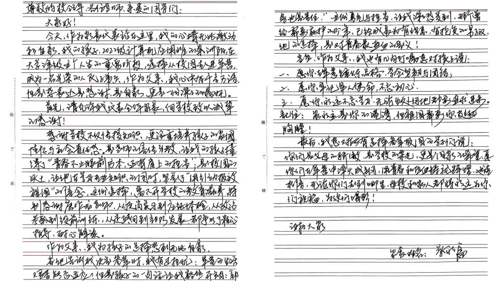 家长在信中提及,希望儿子在部队磨炼意志、强健体魄,增长本领才干,同时勿忘母校,不忘初心,争做有情怀、讲奉献、敢担当的物院学子。希望儿子响应祖国召唤,立志做有理想、敢担当、能吃苦、肯奋斗的新时代好青年,让青春在火热军营中绽放绚丽之花。