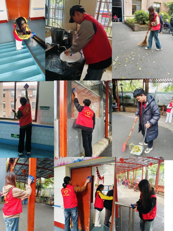 演出结束后,同学们分组开展义务劳动。女生们细心擦拭走廊扶手、整理房间绿植,男生们则承担起庭院清扫和器材维护工作。大家不怕脏、不怕累,仔细地擦拭着门窗玻璃、扶手栏杆,认真清扫每一个角落的灰尘和垃圾,用实际行动为老人们创造更加整洁舒适的生活环境。