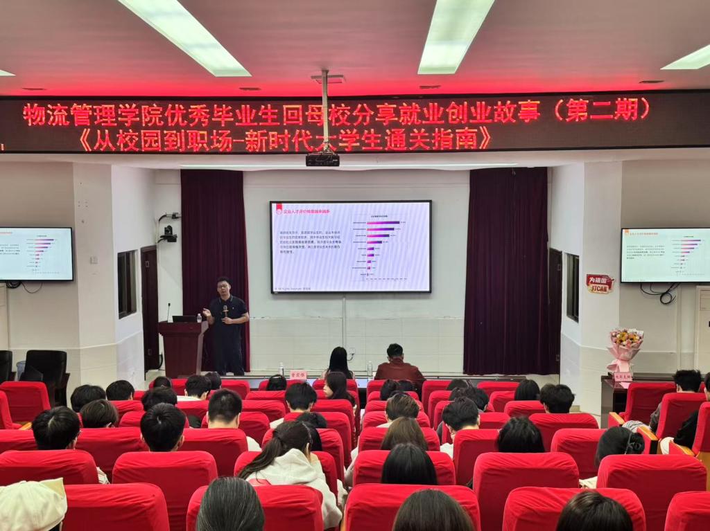 本次活动特邀物流管理学院2004级优秀校友曹需根担任主讲嘉宾。他目前是劲仔食品集团培训文化高级经理,拥有15年企业培训与人才发展经验,曾先后任职于都市丽人、老百姓大药房、太平鸟等上市集团。他以《从校园到职场——新时代大学生通关指南》为题,结合个人履历,从“就业形势冷思考”“求职六边形战士”“职业发展的第二曲线”“从‘菜鸟’到‘骨干’的成长案例”等四个方面作了分享。曹需根深度剖析就业市场趋势与挑战,强调大学生应基于兴趣与能力锚定职业方向,就业前需深度调研行业岗位。他提出“六边形战士” 能力模型,即专业技能、沟通协作、创新思维、学习应变等核心能力,并结合实践经验详解能力培养路径。谈及职业发展,他以自身从普通员工到企业骨干的蜕变历程为例,分享把握机遇、持续学习、突破瓶颈的策略,着重讲述不同阶段应对挑战的经验总结。互动环节中,针对“AI 时代如何提升核心竞争力”“快速适应职场角色” 等热点问题,曹需根建议以空杯心态持续学习,以行动力破局,通过强化学习力、创新力与跨领域整合能力,在变革中掌握主动权。智慧物流2301班吕洁同学表示,学长的分享印证了“成功无捷径,唯有脚踏实地”的道理,为大家明晰了职业发展的奋斗方向。
