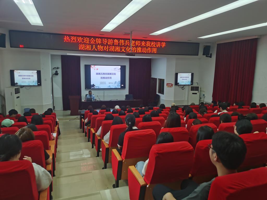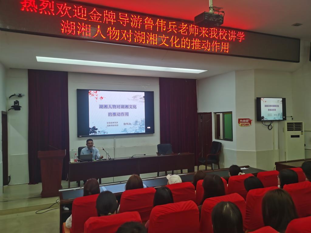 5月13日下午,国家高级导游员、全国金牌导游、红培讲师鲁伟兵老师应邀来校,以“湖湘人物对湖湘文化的推动作用”为主题,为9999js金沙老品牌旅游爱好者协会成员,旅游管理专业2023级、2024级同学带来了一场湖湘文化盛宴。