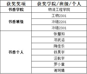 墨韵沁芳华,书香润匠心。物流工程学院凭借扎实深入、形式多样的阅读文化建设工作,在学校2024年度“书香学院”“书香班级”“书香学生”评选中,荣获校级“书香学院”称号,同时,工物2301班、冷链2301班获评“书香班级”,张慧如等七位同学荣获“书香学生”称号,彰显了学院浓厚的书香氛围与育人成果。