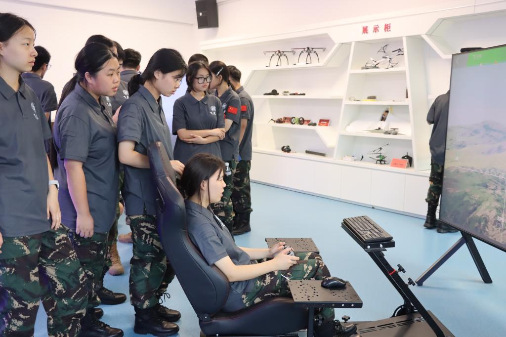 在民兵训练基地,师生们体验武装部配备的模拟射击训练系统,在专业指导下进行战术动作训练,直观感受现代军事训练的科技化与实战化。在无人机应用展示环节,武装部官兵详细讲解了无人机在侦察、救援等领域的军事应用,并指导学生操作无人机设备。“科技赋能国防的实践让我大开眼界,也让我更加坚定了投身国防事业的决心。”飞虎营营长、计应Java专业学生刘振洋感慨道。