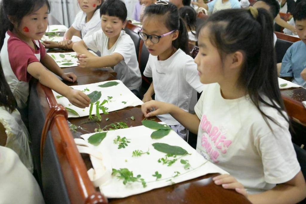 拓印环节同样精彩。队员们向孩子们介绍这项能“复制”文物图案的传统技艺后,带领大家用树叶、花瓣等自然材料,在帆布包上创作拓印作品。“咚咚咚”的敲击声中,枫叶、银杏叶的纹路逐渐清晰。“我的包上长出金色小路啦!”“快看,我的树叶会跳舞!”孩子们举着独一无二的帆布包欢呼,这份兼具创意与自然气息的作品,成为他们最珍贵的夏日礼物。