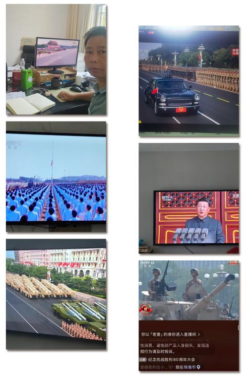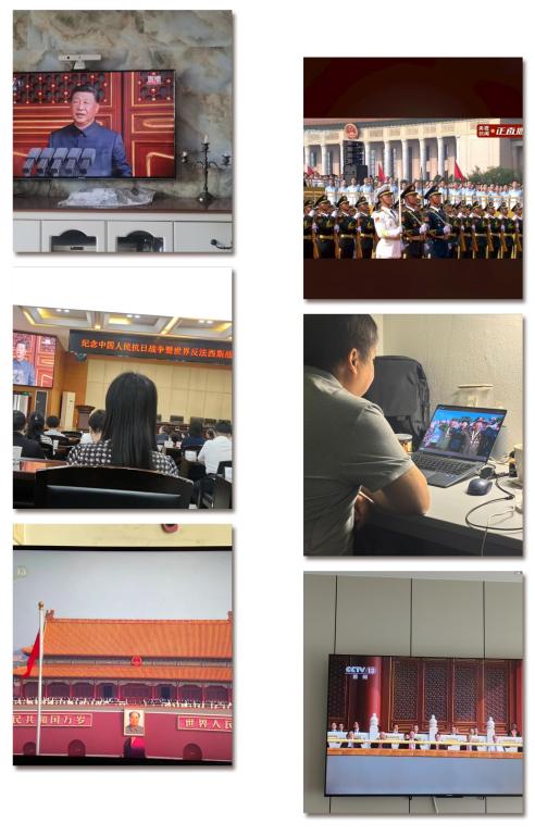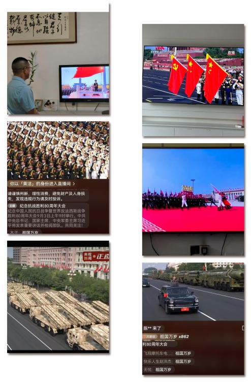 活动内容丰富多彩,形式多样。上午,各支部组织观看了气势恢宏的九三阅兵仪式直播;晚上八点,师生们继续观看了纪念中国人民抗日战争暨世界反法西斯战争胜利80周年文艺晚会《正义必胜》。此外,各支部还通过党总支群观看了微短视频《我自抗战来》,并认真学习了人民日报《正义必胜 和平必胜 人民必胜——写在中国人民抗日战争暨世界反法西斯战争胜利80周年之际》等重要文章。