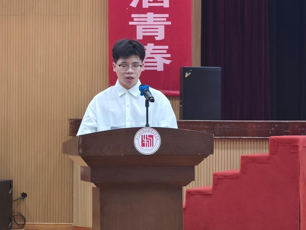 计应(web)2501班周焕作为新生代表发言,分享自己来到物流信息学院的初衷与对未来的期待,号召全体新生明确目标,持之以恒;保持热情,全面发展;胸怀家国,勇担使命。以奋斗为笔、行而不辍、踔厉奋发,用心经营好自己的大学生活。