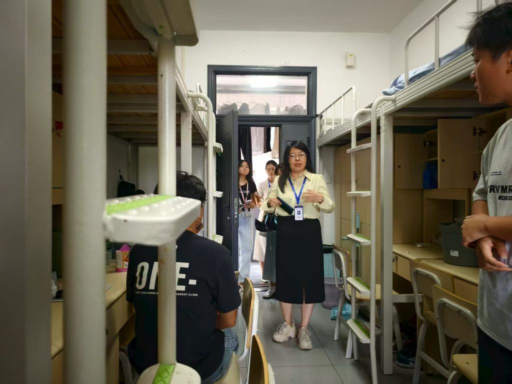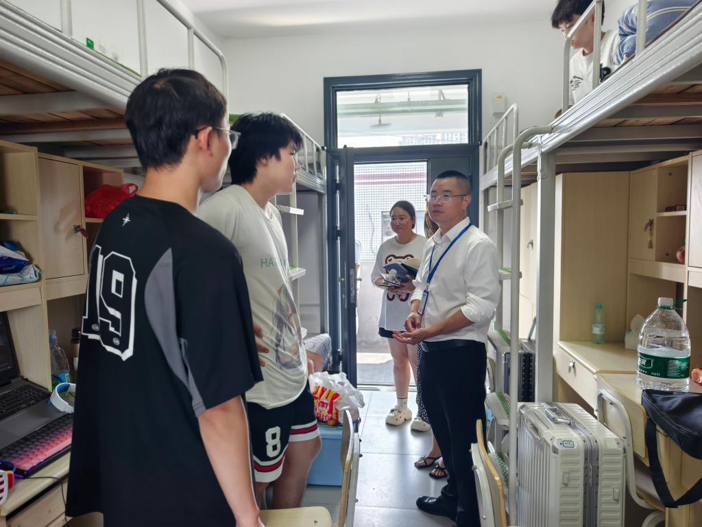 走访过程中,学院领导与辅导员们逐一走进每间宿舍,仔细查看住宿环境,从床铺设施、水电安全到卫生条件,逐项确认细节,确保新生能拥有安全、舒适的居住环境。每到一间宿舍,党员老师们都主动与新生亲切交谈,详细询问他们的报到流程是否顺利、行李物品是否齐全、对宿舍生活是否适应,耐心解答大家关于课程安排、校园服务、社团活动等方面的疑问。
