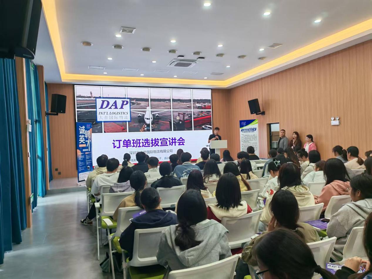为深化产教融合,精准培养高素质技术技能型物流人才,10月16日,深圳大普国际物流有限公司在学校创新创业基地举行了“大普国际物流订单班”校园选拔宣讲会,国际物流学院相关专业的数百名学子踊跃参加,现场座无虚席,气氛热烈。