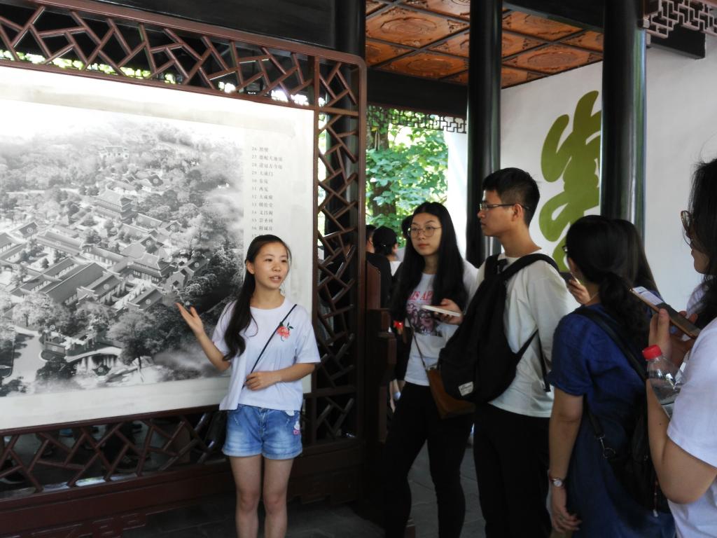 在杨琼老师的带领下,同学们来到岳麓书院。通过前期的课堂讲析、导游词背诵,同学们开始分组讲解书院中的各个景点(前门、赫曦台、讲堂、御书楼、文庙等)。实地讲解过程中,有的同学深感自己知识储备缺乏,或言之无物或内容空洞;也有准备充分的同学,在讲解过程中,身边聚集了一批“粉丝”,真正体验到身为一名导游的荣耀。
