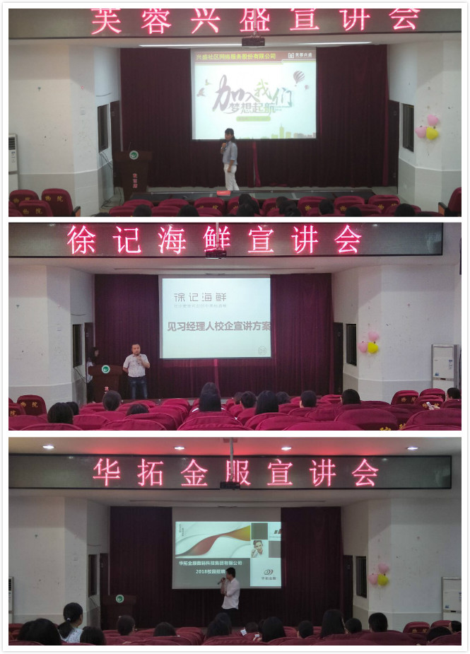 2018年5月29日下午,兴盛社区网络服务有限公司、湖南徐记酒店管理有限公司和华拓金服数码科技集团有限公司三家公司的招聘宣讲会在学术报告厅成功举办。物流商学院2016级部分学生参加了本次宣讲会。